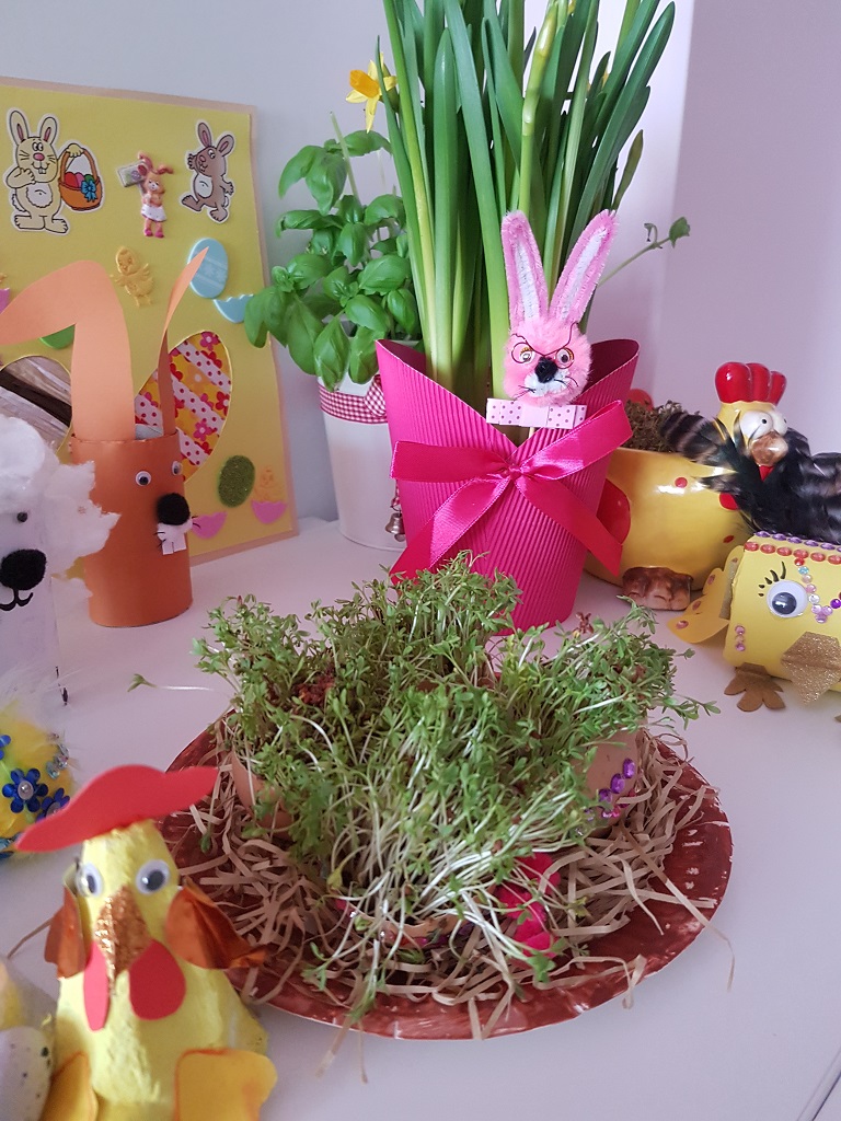 Dużo czasu zajęły mi przygotowania do świąt. Miałam ręce 1pełne roboty, umalowane farbą dłonie, posklejane klejem palce. Na szczęście nie było ofiar przy wycinaniu z papieru. Zrobiliśmy z Panią Renią pięknego zająca, pisanki, różnego rodzaju kurczaczki. Było bardzo wesoło i bardzo pracowicie.